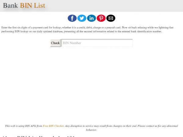 Bin search information lookup have over 340,000 unique bin numbers in the database,binchecker our bank bin database allows you to search the first 6 or 8 digits of a credit or debit card bin number. Bank identification number (bin) or issuer identification number (iin) is the first six digits of a bank card number or payment card number. A bank identification number, or bin, refers to the initial sequence of 4 to 6 numbers on a credit card and used to identify the card's issuing bank or other financial institution. Bin code check or iin lookup are the first 6 digits on a credit card. Bin lookup tool helps to find bank card issuer.